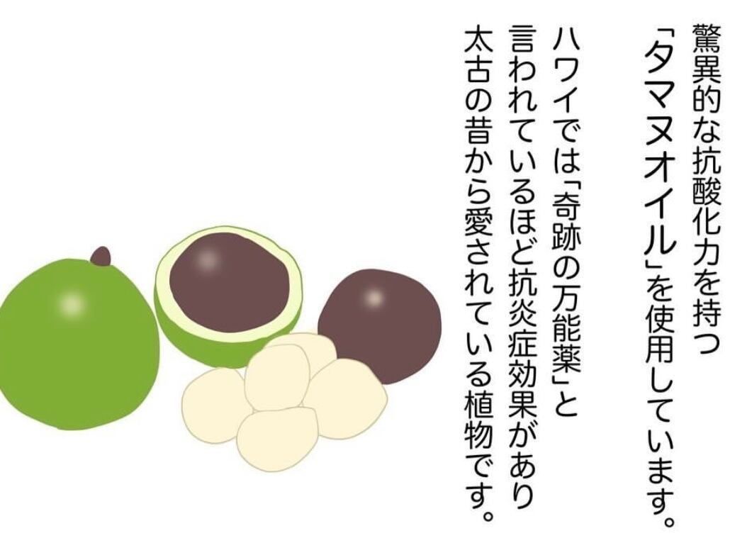 古くから『奇跡の万能薬』とも言われ、ニキビ・ニキビ跡・火傷・アトピー性皮膚炎・シミ・しわとあらゆる皮膚悩みを解決してきた、高い抗酸化力をもつタマヌを使用。